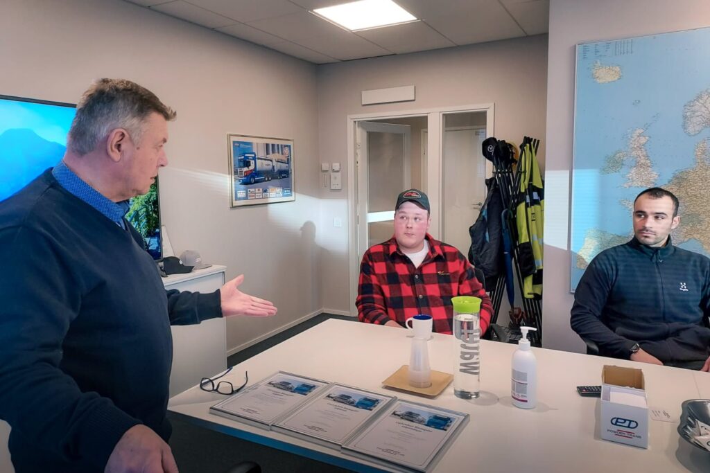 Ensimmäinen Carl-Johan Blomqvistin nimeä kantava stipendi jaettiin kolmeen osaan. Kuvassa stipendin saaneet logistiikka-alan opiskelija Atte Hellbom (kuvassa keskellä), oppisopimusopiskelija Ayyoub Mohammadamini (oik.) yhdessä Powder-Transin hallituksen puheenjohtajan, Carl-Johan Blomqvistin kanssa. Kolmas stipendin saaja, Jyväskylän ammattikorkeakoulu (Jamk) päätti jakaa stipendin edelleen oppilaitoksessa logistiikkainsinöörin opintoja suorittavalle Teemu Kauhaselle.